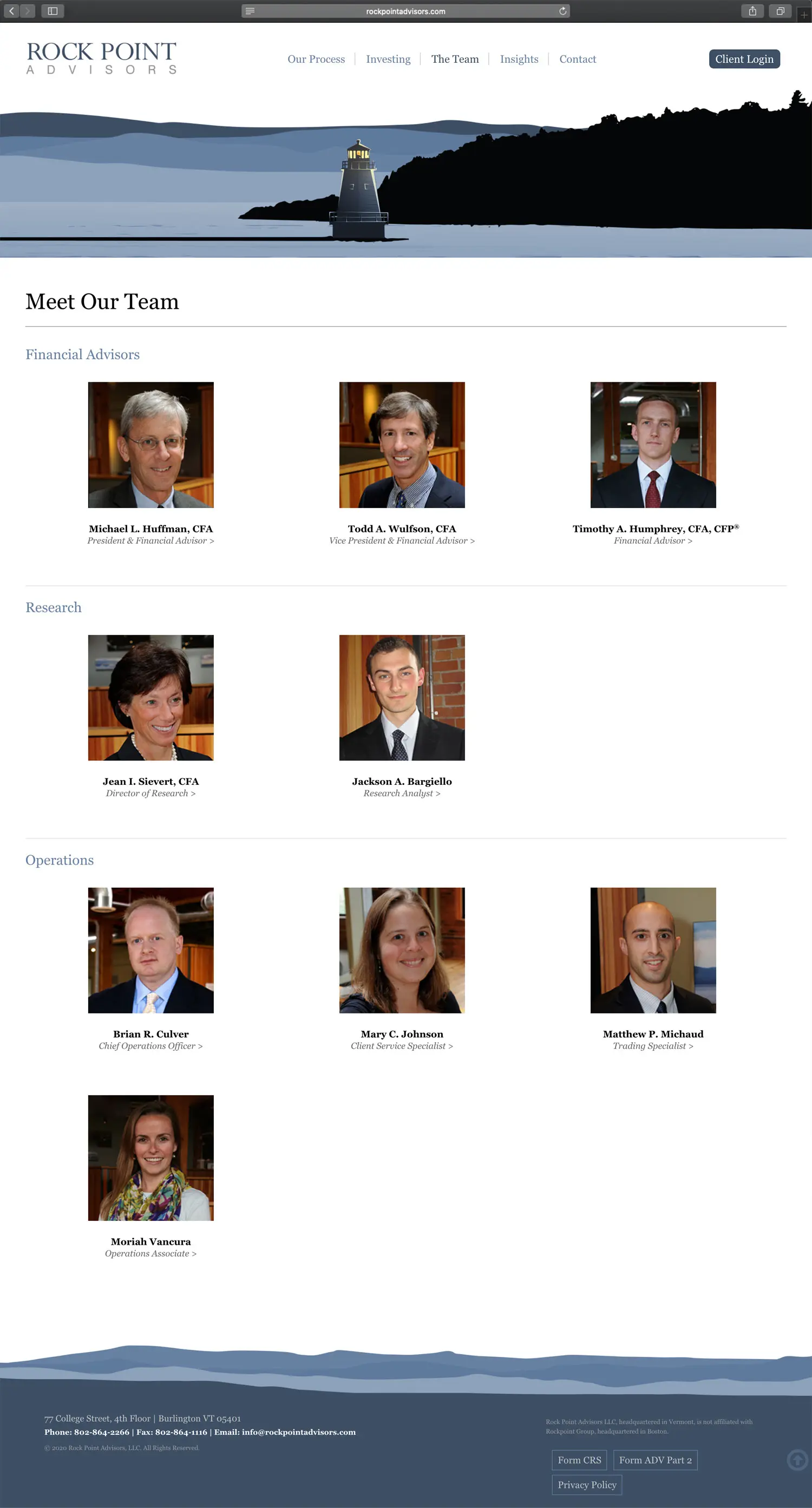 After conducting a custom-tailored leadership meeting to understand exactly how Rockpoint wanted to present their brand, we reviewed several Vermont-based and Northeast financial advisory firms. This research helped us develop a clear content architecture that effectively communicated the core elements of the Rockpoint brand. We then designed the site with custom illustrations that visually represented their commitment to thoughtful, long-term investment strategies.