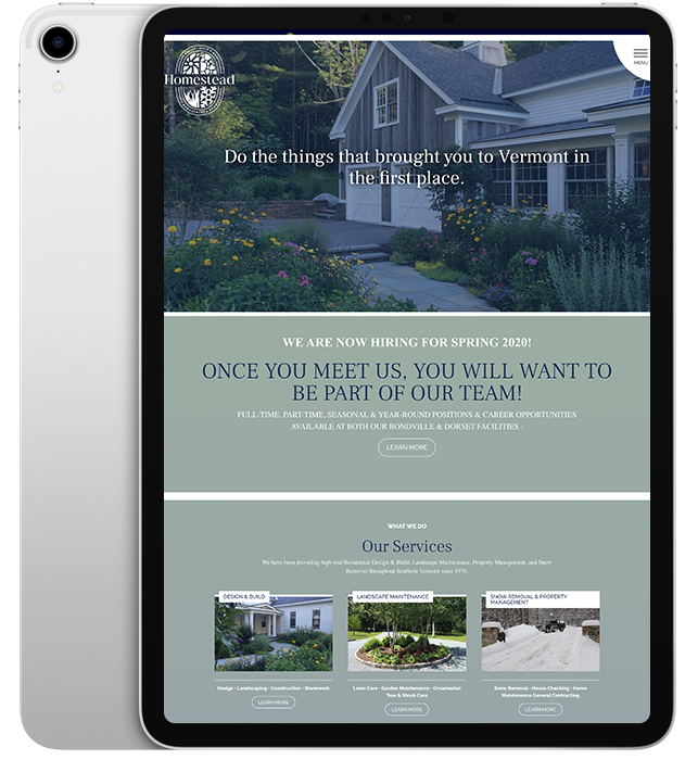 Homestead Landscaping, a trusted name for quality landscape products and services in Southern Vermont, needed a website that would effectively represent their brand while attracting new clients and potential employees. With a focus on both business growth and team expansion, the new site needed to highlight the company's commitment to excellence, its community focus, and the opportunities it offers for those looking to join their team.